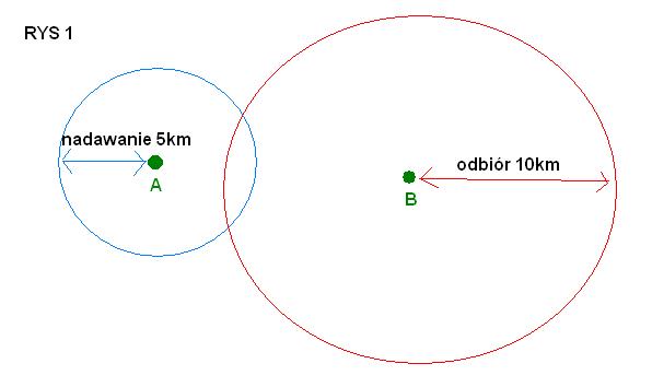 Załóżmy, że zasięg nadawczy jest około 5km, a odbiorczy około 10km.