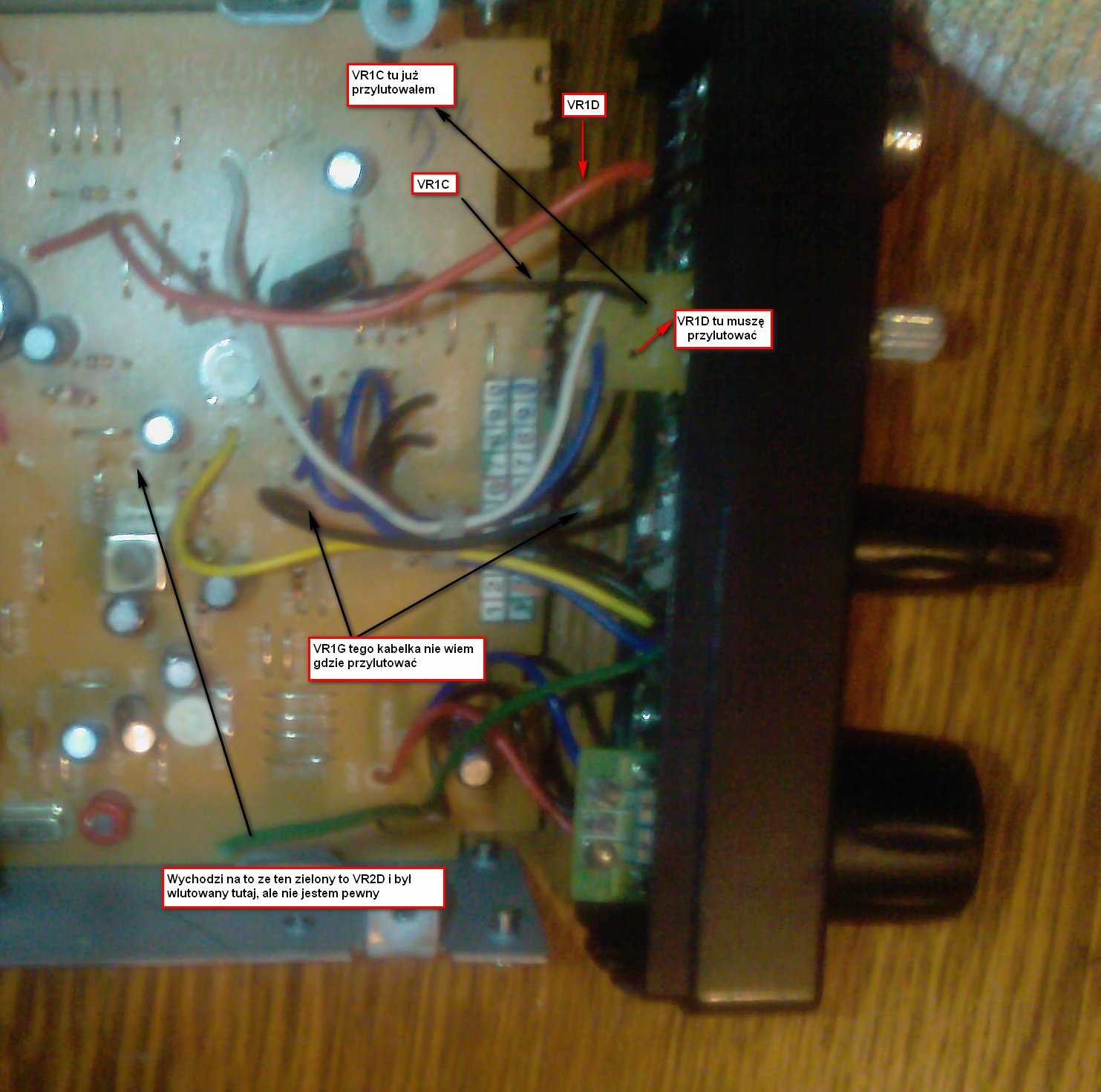 Jest to kabelek VR1G - wychodzi z płyty i nie wiem gdzie go wlutować, oraz taki zielony kabelek wychodzi z pokrętła sql i nie dochodzi do płyty bo jest urwany (nie wiem oznaczenia, chyba VR2D)