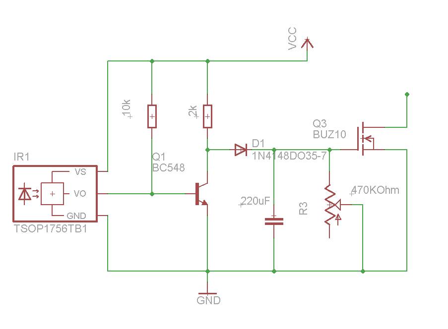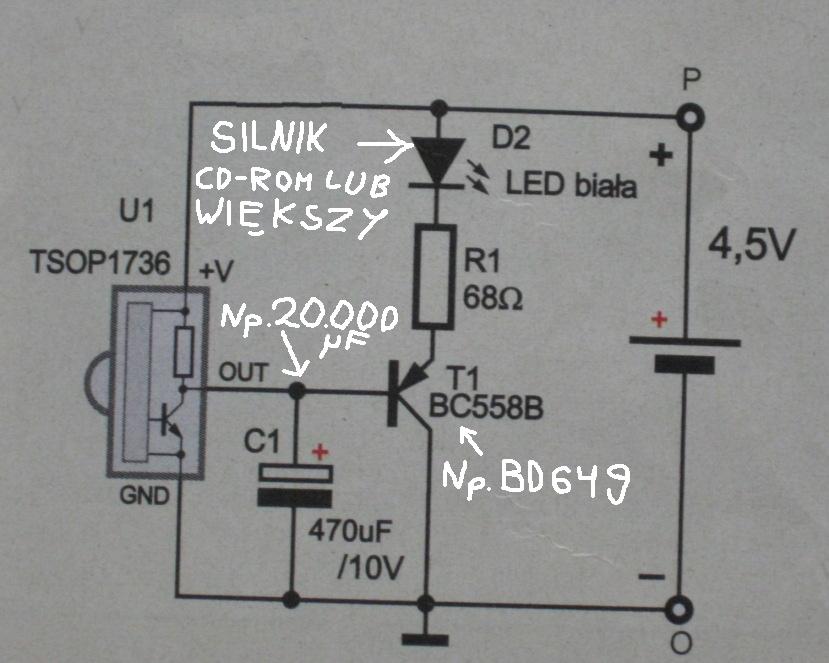 Szukam schematu sterowania silnika DC pilotem.Ten schemat pokazuje sterowanie diodą która zaświeca się na chwile po nacisnieciu w pilocie guzika.Chciałbym zamienić diodę na silnik cd-rom lub lepszy,większy,wydajniejszy na podobne napięcie 4,5 V.Jasna sprawa,że trzeba zamienić tranzystor na mocniejszy bo BC... sie spali,do tego jakiś pojemny kondensator który by "podtrzymywał" silnik przez parę sekund...(5) to było by naprawde super...Tylko pytanie do tych co się naprawde ZNAJĄ na tym co jak ten schemat przerobić bez uC i NE555.