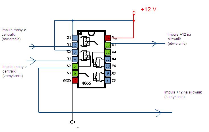 Chętnie zastosowałbym alternatywne rozwiązanie najlepiej na układzie scalonym, który owe przekaźniki zastąpi. Jednak napięcie w samochodzie oraz duże przeciążenia na siłownikach mogą taki układ zniszczyć.