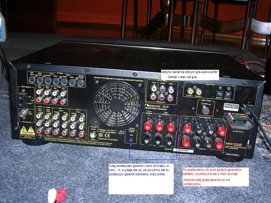 Witam, moim problemem jest podlączenie glosników 5.1 do wzmacniacza Nakamichi AV-8. Nie posiadam instrukcji obsługi. Jak na moje rozumowanie, glosnik centralny podlaczam pod Center, tyl pod Rear, a przód pod Front. Glosnik basowy gdzie mam podlaczyc ? Gdy podlaczam glosniki do Center i Rear to nie wydobywaja z siebie glosu... Sprzet jest z drugiej reki wiec moze jest z nim cos nie tak ? Jedynie dzialają po podlaczeniu do Front Speakers. Moze trzeba nacisnac ktorys z guzikow z przodu lub na pilocie by przelaczyc na 5.1 ? Oto zdjecia: