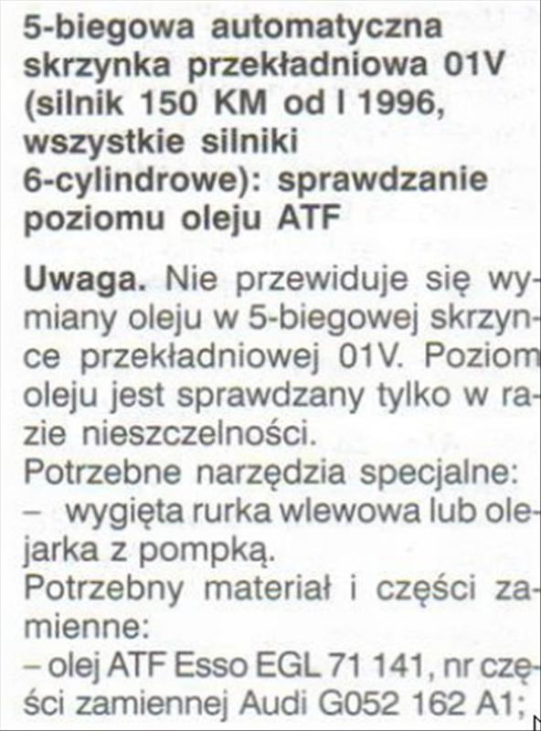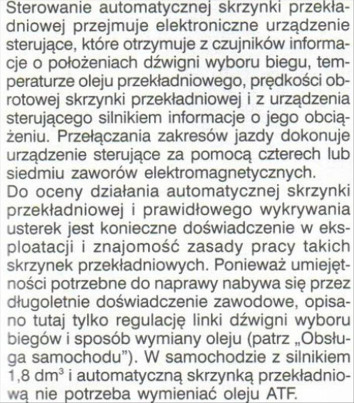 Bez względu na rodzaj zastosowanego oleju (mineralny czy syntetyczny) ulega on zużyciu. Zmienna temperatura pracy, postępujący proces starzenia (olej mineralny), zanieczyszczenie ciałami obcymi powodują zmianę składu chemicznego i parametrów oleju. Aby ustrzec się przed uszkodzeniami skrzyni spowodowanymi eksploatacją na zużytym oleju pamiętaj, że każda automatyczna skrzynia biegów wymaga okresowej wymiany filtra i oleju. Różnice polegają jedynie na przebiegu przy jakim w/w czynności warsztatowe należy wykonać.