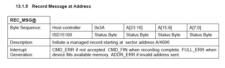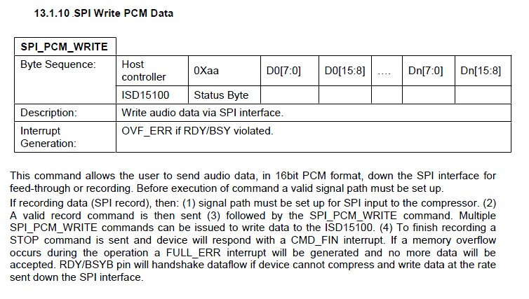 Docelowo napiszę program na PC(C#) wysyłający dane przez port COM, następnie chce wykorzystać mikroprocesor jako bufor i dalej przesyłać dane poprzez SPI do ISD, układ sterujemy za pomocą odpowiednich komend opisanych w nocie katalogowej.