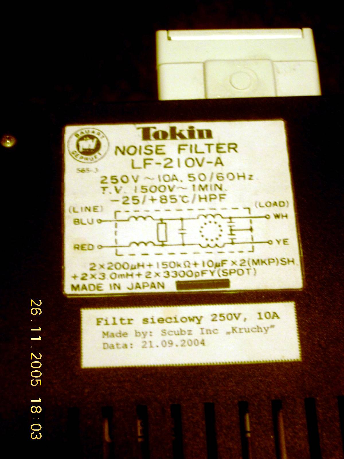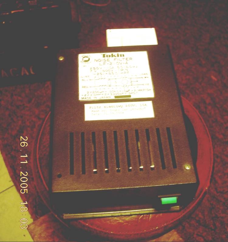 Tyle się mówi o filtrach sieciowych zwłaszcza w postach dotyczących sprzętu audio (-filskiego). Czytałem jakiś czas temu artykuł na jednej ze stron www (http://bg.awf.wroc.pl/~bryan/audio/ZTS_filtr.html ), na której umieszczono schemat montażowy takiego filterka. Owszem wykonanie jest super, ale koszta ...hmm.. Takie elementy jak ferryty są drogie.. więc koszt wykonania w standardzie podobnym do zaprezentowanego jest znaczny. Mam więc takie pytanie czy nie można by zastosować przemysłowych filtrów sieciowych takich jakie można dostać na każdej chyba giełdzie z elektroniką, a właściwie na tzw: szaber platzach czyli miejscach gdzie można znaleźć wszelaki złom elektroniczny. Zaopatrzyłem się w taki „noise filter” firmy Tokin ( wyszabrowany najprawdopodobniej z jakowejś machiny ) za całe 10PLN. Myślę zrobić sobie filtr sieciowy dodatkowo w obudowie od zasilacza komputerowego (albo podobnej) z wykorzystaniem zakupionego elementu. Na giełdzie leżało kilka takich (każdy inny – ten jest chyba najmocniejszy bo 10 Amperowy). Czy takie coś spełni swoje zadanie.. Planowane zastosowanie to podłączenie wzmaka lampowego małej mocy, komputera i innych rzeczy.