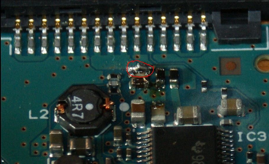 Po podłączeniu, faktycznie zimny. Mimo, że na gwarancji, rozebrałem obudowę (dane ważniejsze). Klejone bydle i zatrzaski do tego tak zrobione, że muszą się ułamać. No ale podłączyłem do mojego adaptera i nic. Dalej nawet nie zakręca silnikiem. Płytka elektroniki zdejmuje się z tego modelu bez żadnych problemów, więc odkręciłem, założyłem swoje super ruskie powiększające bryle... I nic. Nic nie jest sfajczone, nic co by wskazywało na jakieś zimne luty itd. No to dawaj doedukować się na ELEKTRODA.PL. Po intensywnej lekturze miernik w dłoń i szukamy po kolei od +5V. O i jest drań co przerywa linię zasilania. Dioda to nie jest bo przerwa w obie strony. Na spalony nie wygląda, gówno do tego takie małe, że nawet moje lupo-bryle nie dają rady. Ale mikroskop stwierdził, że na grzbiecie ma "2". No i zamiast być gładki i matowy, lakier ma na grzbiecie w formie jakby soczewki. Stwiedziłem, że pewnie się wypuczył od gorąca i po hamsku nalutowałem mu na grzbieta kawałek druta. Nie była to co prawda pistoletówka, ale mój grot i tak był grubszy niż elementy, co widać na zdjęciu.