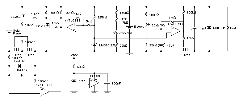 Układ ten jest przeznaczony do ładowania akumulatorów ołowiowych wykorzystujący do tego celu ogniwa słoneczne. Dioda, która zazwyczaj zapobiega rozładowywaniu się akumulatora przez baterie słoneczną została zastąpiona kombinacją tranzystorów polowych FET. Jak zapewnia autor, przedstawiona ładowarka zatrzyma ładowanie akumulatora, jeśli zostanie osiągnięte określone napięcie. Natomiast ładowanie akumulatora zostanie wznowione, jeśli napięcie dostatecznie spadnie. Cały cykl odbywa się automatycznie. Ładowany akumulator jest odłączany jeżeli napięcie ładowania spadnie poniżej 11V. Natomiast podłączany, ponownie przy napięciu ładowania około 12.5V.