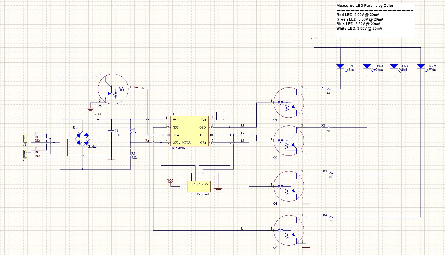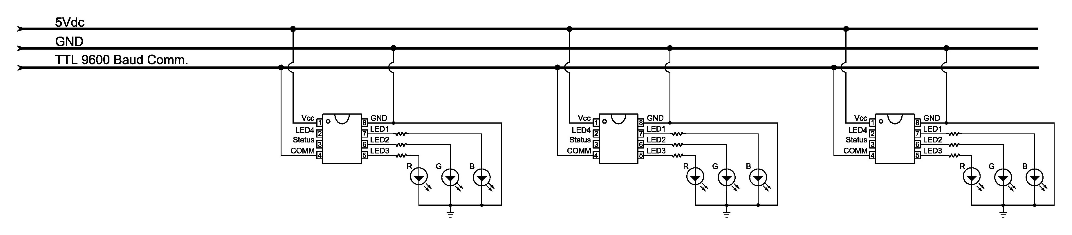 Jest to projekt modułów świetlnych PWM opartych na diodach LED, które można połączyć ze sobą w długie węże świetlne. Inspiracją do stworzenia takiego węża świetlnego był sezon świąteczny. Autor początkowo chciał zbudować wąż świetlny z modułów, które połączone byłyby ze sobą tylko parą przewodów. Moduły miały być sterowane za pomocą częstotliwości i przy użyciu filtrów, a bazować miały na elementach analogowych. Lecz podczas testów takie układy nie spełniły określonego celu i autor projektu postanowił zaprojektować moduły sterowane cyfrowo, moduły LED, którymi w pełni da się sterować przy użyciu modulacji PWM. Autor projektując moduły chciał żeby były jak najtańsze i żeby w każdym module był mikrokontroler sterujący kolorem i jasnością diod LED. Umieszczenie mikrokontrolera w każdym module zdecydowanie ułatwia sterowanie diodami LED. Moduły zbudowane są na mikrokontrolerze PIC12F609 firmy Microchip. Połączone są ze sobą przy pomocy trzech przewodów jak to pokazane jest na schemacie poniżej, pochodzącym ze strony źródłowej.