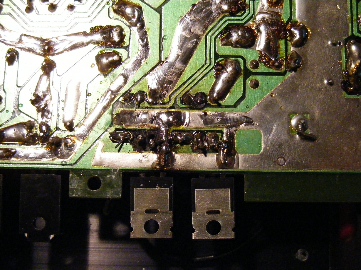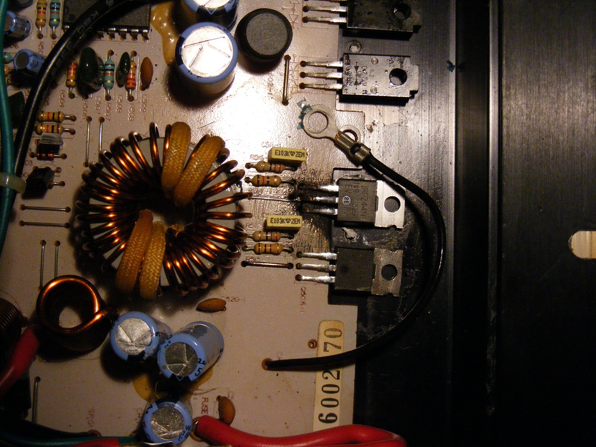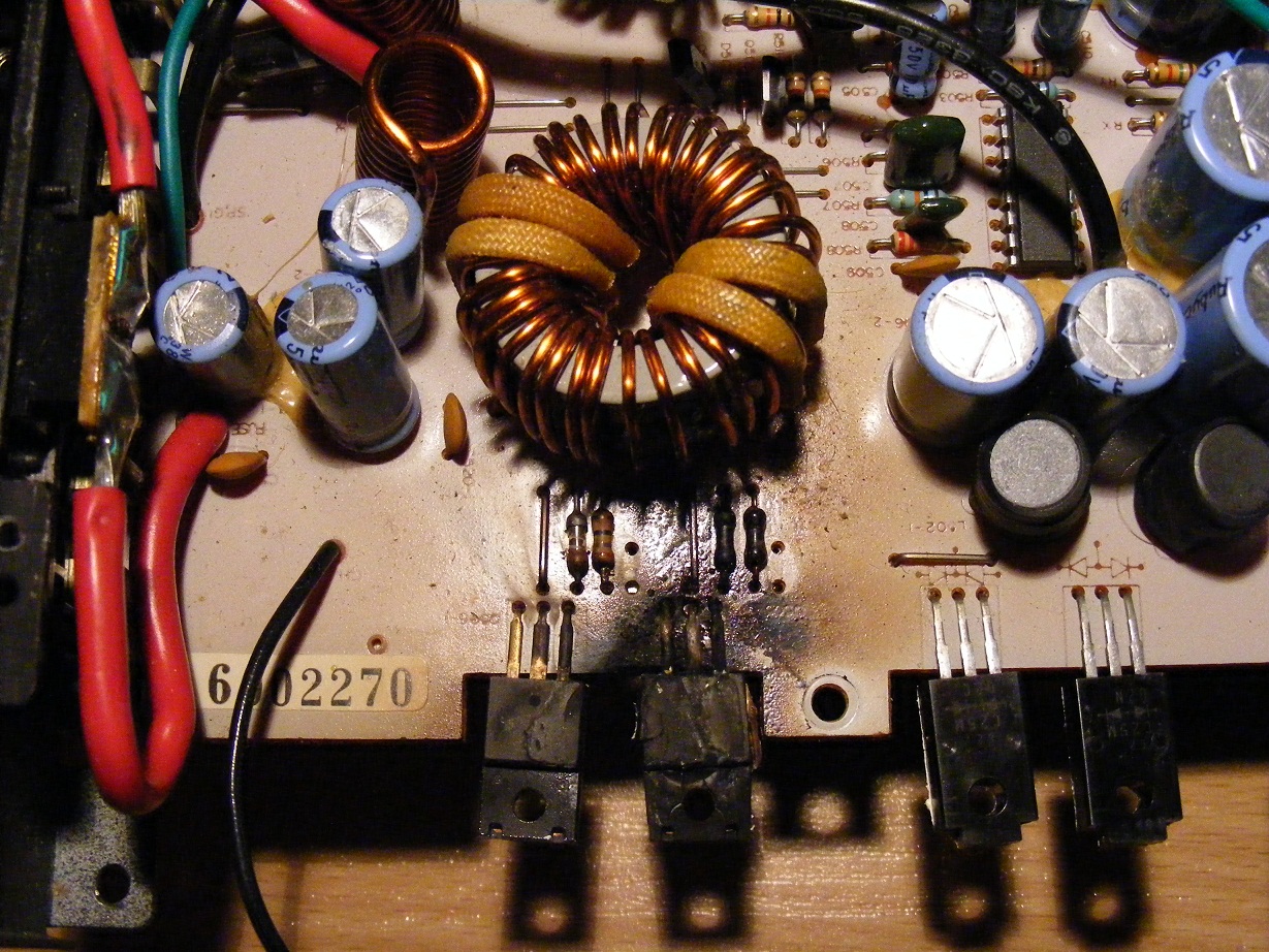 Dostałem dziś wyżej wymieniony wzmacniacz RTO SX-7002 wraz z przypuszczeniami, że jest on uszkodzony (skąd te wnioski - nie wiedziałem), dlatego pierwsze co zrobiłem, to odkręciłem pokrywę i zauważyłem, że pierwsze z brzegu dwa tranzystory K1420 (mosfety jak się okazało) wręcz zwęglone. Wzmacniacz ma symetryczne ułożenie scalaczków, dwie przetwornice, a wcześniej opisane K1420 prawdopodobnie pracują przy samych przetwornicach ( co później postaram się ukazać na fotkach ). Chciałem zobaczyć, co będzie się działo przy podaniu zasilania na zaciski wzmacniacza i zauważyłem, że ogólnie jest gdzieś zwarcie (iskrzenie) a zielona dioda w ogóle się nie zapala. Dziwne, że te zwęglone K1420 są tylko po jednej stronie a po drugiej nie ruszone ( przynajmniej widocznie ), a zwęglone są dwa, gdyż po tyle sztuk występują po każdej stronie. Reszta elementów poza tymi K1420 ( i czterema rezystorkami koło nich) nie jest zwęglona, czarna czy jakkolwiek widocznie uszkodzona.