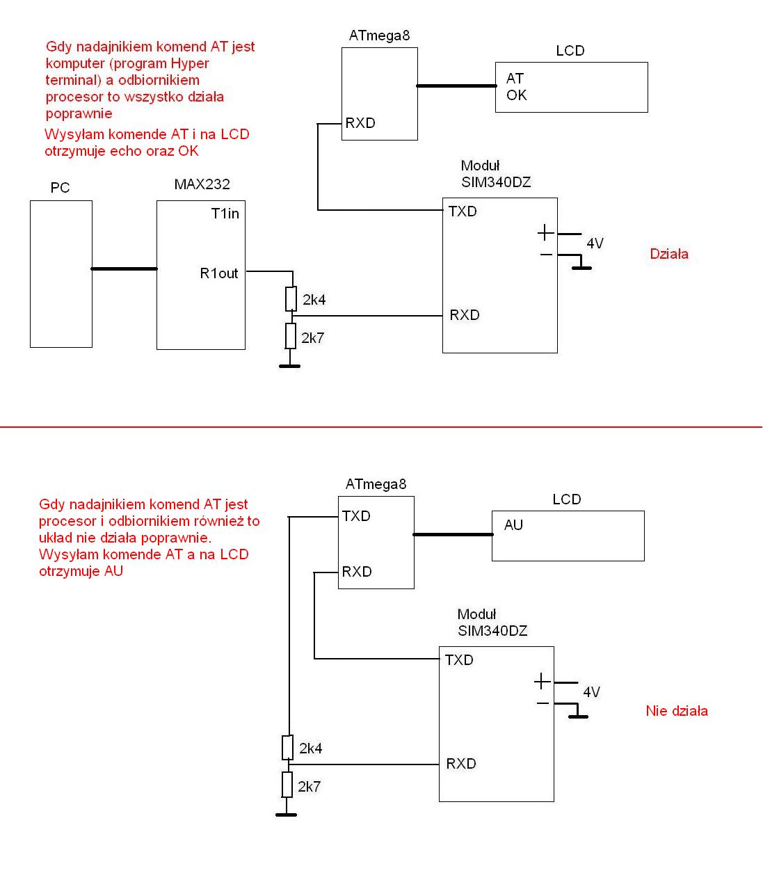- gdy drugi raz wyśle komende AT na LCD otrzymuje echo w postaci A U, brak odpowiedzi typu OK, ERROR itp