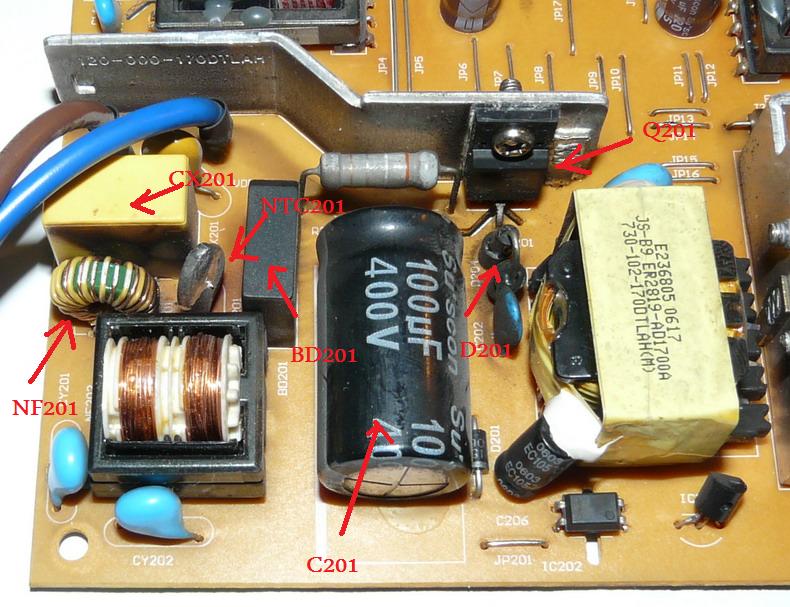 Oznaczenia i wartości elementów spisane ze schematu jednak nie ma tam nic o elemencie NF 201 i NTC 201. Proszę o pomoc w identyfikacji może ktoś ma taki schemat lub wykaz elementów bądź ktoś z aktywnych tutaj fachowców wie co tam można wlutować i ewentualnie objaśnić co to za elementy przeze mnie wyżej wypisane.