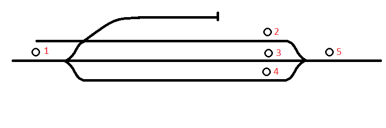 Rysunek torów jest bardzo uproszczony – czujników będzie znacznie więcej. Muszę sprawdzać czy długość pociągu nie przekracza długości peronu i przewidzieć ewentualne sytuacje krytyczne (np. wszystkie perony zajęte).