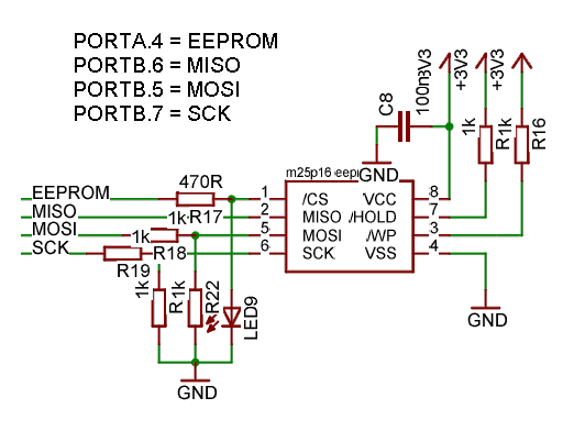 Posiadam schemat płytki AVR, autr twierdzi, że nie da się wykorzystać pamięci EEPROM (zapis i odczyt danych z mikrokontrolera ATMEGA16) z powodu złego podłączenia. Nie posiadam żadnego sprawdzonego programu, który miałby testować lub zademonstrować działanie EEPROM. Po usłyszeniu, że jest błąd, stwierdziłem, że nie ma po co poświęcać czasu na analizę datasheetów i próby uruchomienia pamięci. Jedyne, co wyczytałem, to to, że zapis i odczyt danych odbywa się szeregowo wykorzystując do tego dwie linie (MISO i MOSI, w datasheetach są inne oznaczenia).