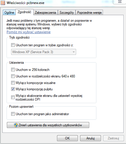 2) Zmienić ustawienia zgodności dla programu do edycji PCB: pcbnew.exe