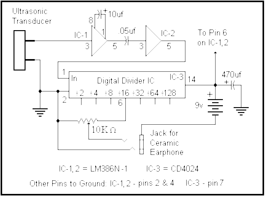 Układ został nazwany przez autora "wykrywaczem nietoperzy", gdyż pozwala na wykrycie obecności tych zwierząt w danym miejscu. Zasada działania opiera się na dzielniku częstotliwości. Przeciętny nietoperz emituje ultradźwięki z zakresu 50-100kHz służące im do echolokacji, oczywiście człowiek z górnym zakresem słyszalności ok. 20kHz nie jest w stanie usłyszeć dźwięków wydawanych przez te zwierzęta. Z pomącą przychodzi przedstawione urządzenie. Do budowy wykorzystano czujnik ultradźwięków, dwa wzmacniacze LM386, które łącznie zapewniają wzmocnienie ok. 4000x, oraz kostkę CD4024, która realizuje podział częstotliwości przez 16. Całość zasilana jest z baterii 9V.