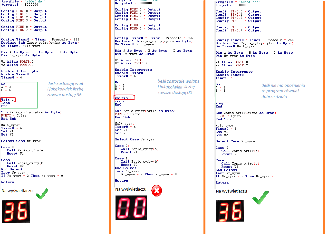 Ale jeśli zamiast rozkazu wait, dam rozkaz waitms i obojętnie jaką liczbę,(np. waitms 999) to na wyświetlaczu pojawia się "00"
