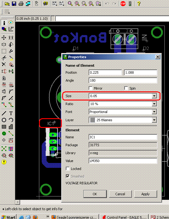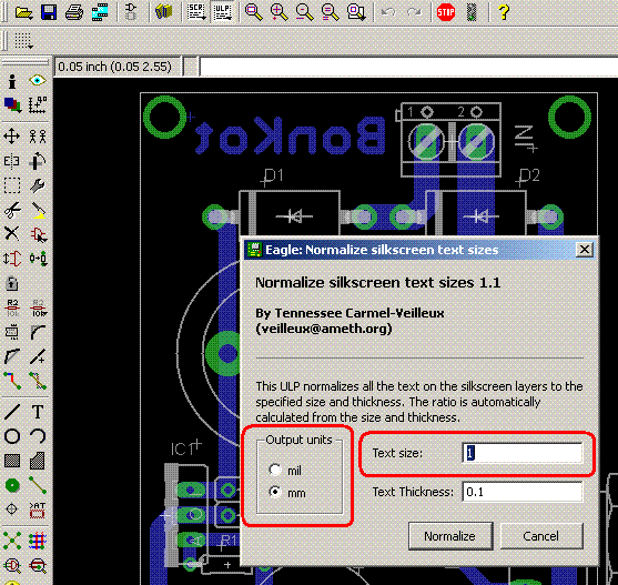 otwórz". Otworzy nam się okienko, a w nim możemy ustawić, w jakich jednostkach będziemy zmieniać wielkość tekstu (mm lub mil) i wielkość tekstu (text size). Po ustawieniu, klikamy "