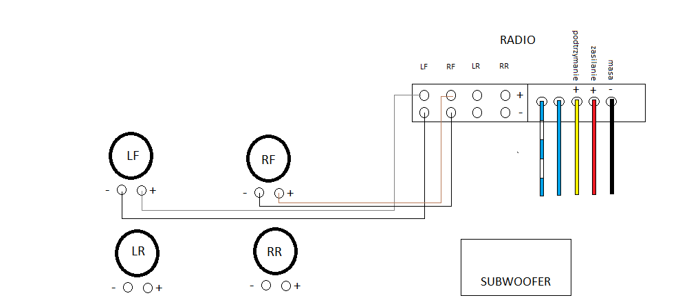 Wiem że podobne tematy były już omawiane ale nie znalazłem odpowiedzi na mój problem. Mam podłączone 2 głośniki z przodu i wszystko ładnie gra i chciałbym podłączyć jeszcze 2 głośniki z tyłu i subwoofer. Instalacja jest zrobiona i wszystko wcześniej chodziło na starym radiu seryjnym czyli 4 głośniki i subwoofer. Kupiłem radio i chce to teraz podłączyć tylko jak? przesyłam schemacik proszę o rozrysowanie jak to powinno być zrobione nie ma żadnego wzmacniacza założonego i ja też na razie nie chcę kupować.