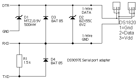 Autor w celu dostosowania poziomu sygnału RS232 do magistrali 1-Wire zbudował mały adapter dzięki któremu jest możliwy odczyt numeru seryjnego. Układ jest zbudowany na płytce uniwersalnej o wymiarach 25 x 18mm. Większość elementów jest w obudowie SMD ale jest kilka rezystorów w większych obudowach. Na płytce znajduje się również dioda LED, która jest kontrolowana przez piny 4 i 7 złącza RS232. Dioda ta nie jest zaznaczona na schemacie, ponieważ została dodana w późniejszym etapie projektu.