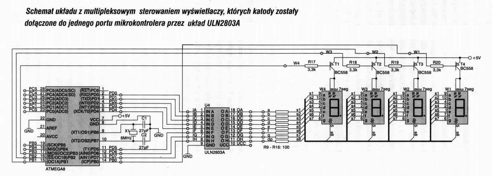 Projekt pochodzi z książki Marcin Wiązania "Programowanie mikrokontrolerów AVR w języku BASOM" . Autor opisuje sterowanie multipleksowe za pomocą dekodera 4543 czyli jedynie do sterowania wyświetlaczami jest potrzebne 5 portów atmegi no i 4 porty na sterowanie wspólnymi katodami lub anodami . Ja swój układ wykonałem bez dekodera i zamiast tego z portu D atmegi podłączyłem 4 dodatkowe wyjścia ,reszta wygląda tak samo , przepisałem program z książki zmodyfikowałem konfiguracje portów (tak jak u mnie dodatkowe te 4) i Bascom wyświetla błędy o tym ,że spodziewa się instrukcji If ... Then. Proszę o pomoc w modyfikacji programu tak by działał bez dekodera. Oto program :