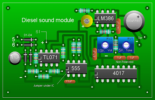Główne zasilanie układu stanowi napięcie 12 V niezależne od napięcia na torach, które podłączone jest do mostka prostowniczego (punkty 3,4). Napięcie trakcji, które odpowiada za zmianę generowanego dźwięku, jest podłączone bezpośrednio z modułu regulującego prędkość kolejki lub bezpośrednio z torów do punktów 5 i 6 mostka prostowniczego. Sygnał wyjściowy z mostka będzie zawsze odpowiedni niezależnie od kierunku poruszania się pociągu.