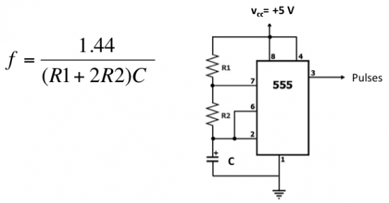 Autor przedstawia rozwiązanie pozwalające na podłączenie klawiatury za pomocą tylko 2 przewodów: jednego dla sygnalizacji wciśniętego przycisku i drugiego informującego procesor o tym który przycisk został wciśnięty. Układ oparty jest na timerze ne555 w konfiguracji astabilnego multivibratora. Układ opiera się na prostej zasadzie. Wyjściowa częstotliwość timera jest determinowana przez 2 rezystory i kondensator, zgodnie z rysunkiem.