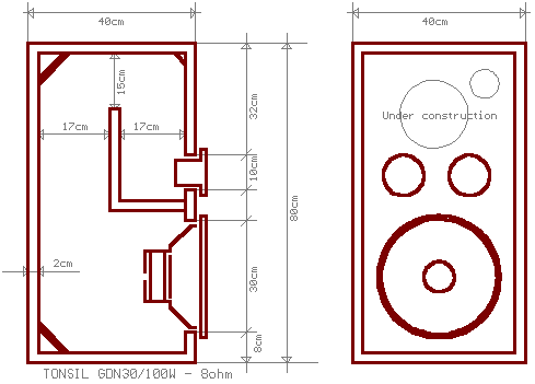 Otóż wykonałem obudowy głośnikowe jak na załączonym rysunku. Nie korzystałem z żadnych obliczeń, bo te wszystkie wzory mnie przerażają. Obudowa została wykonana (na wyobraźnię) z 2cm płyty meblowej, wiórowej.