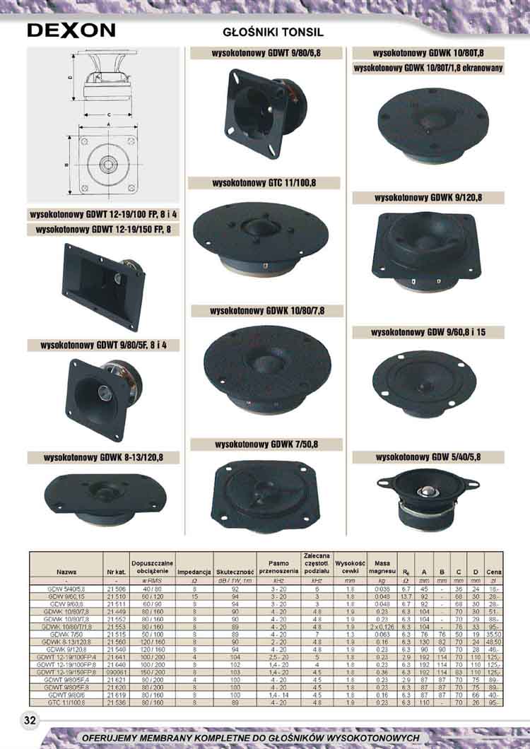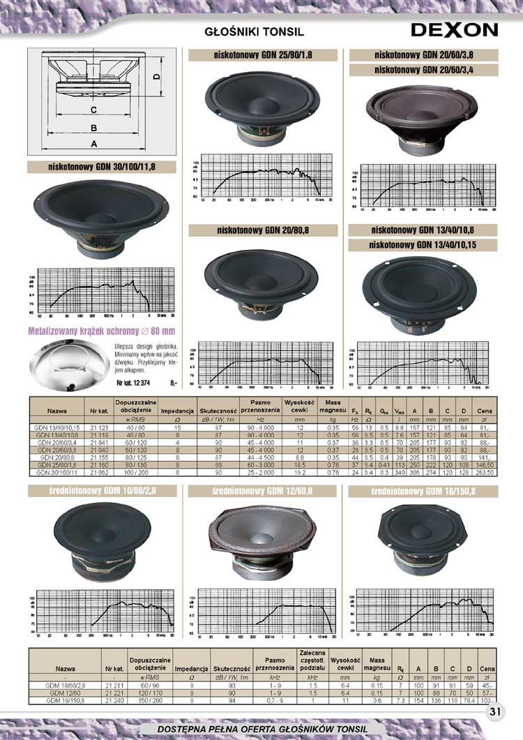Charakterystyk częstotliwościowych swoich głośników Tonsil chyba nigdzie nie publikuje, chociaż kiedyś kupiłem głośniczek wysokotonowy (ale już nie pamiętam symbolu) i w pudełku na karteczce wraz z danymi katalogowymi był wykres ch-ki, niestety bardzo malutki i niewiele było na nim widać. Zresztą charakterystyka głośników zamontowanych w obudowie zwykle jest dodatkowo "ulepszana" przez efekty związane z kształtami zewnętrznymi, dyfrakcjami na krawędziach, więc najlepiej samemu sobie zmierzyć charakterystyki w danej obudowie, bo i tak będą one sie baaardzo różniły od charakterystyk katalogowych ( tam sie mierzy na jakiejś dużej odgrodzie, np 1x1m, i w pomieszczeniu dźwiękochłonnym)
