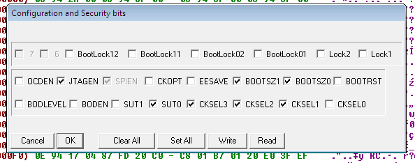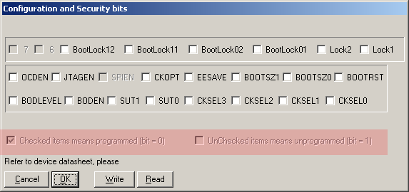 Ponieważ w PonyProg bity są negowane (patrz opis na załączonym przeze mnie screen-ie), więc negujemy to co wynika z bitów które odczytałeś
