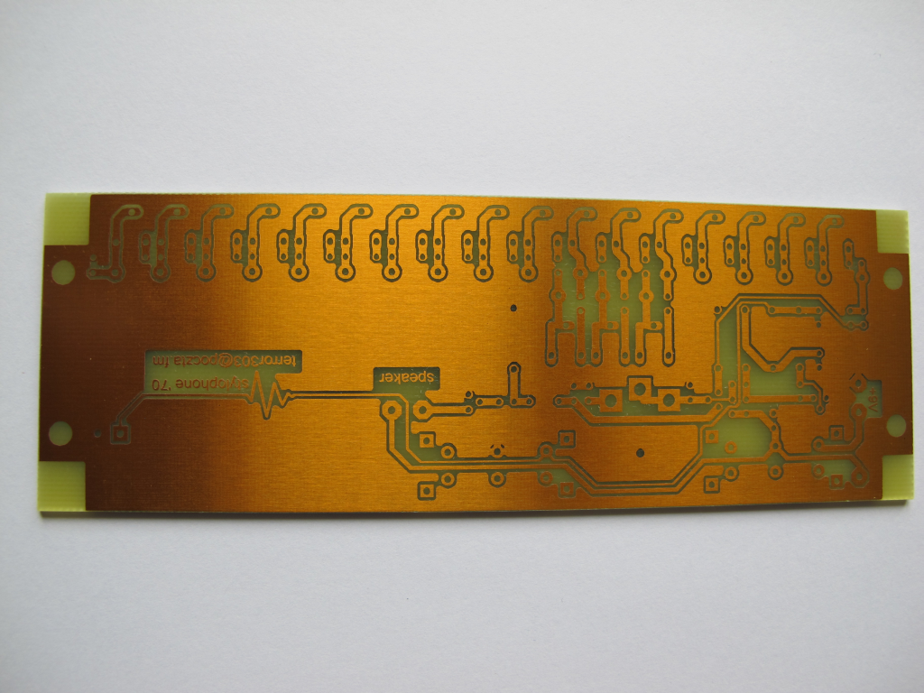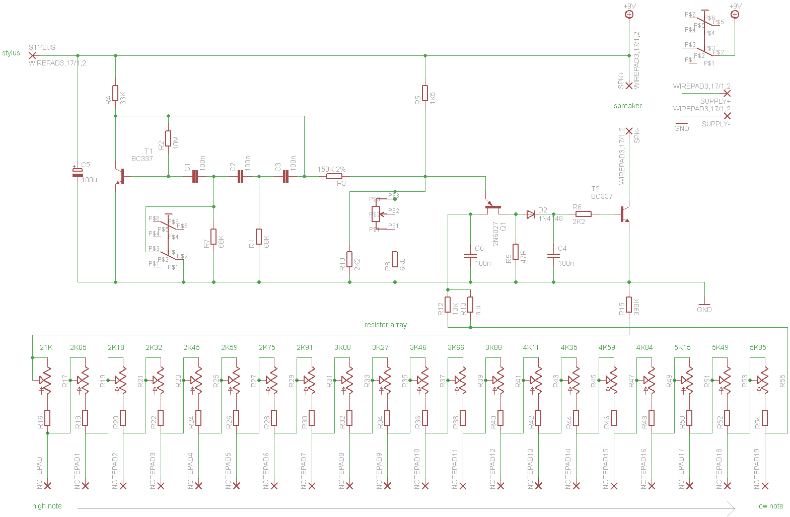 Zdecydowałem się na odtworzenie drugiej wersji urządzenia z początku lat 70'. Obecnie dostępne są odpowiedniki wszystkich elementów zastosowanych w oryginalnym stylofonie poza produkowanymi na zamówienie drabinkami rezystorowymi. Wiele problemów nastręcza znalezienie głośnika o impedancji 75 Ω – jego zamiennikiem może być głośnik 50 Ω stosowany w domofonach i słuchawkach. Zrezygnowano z wyjścia liniowego. Schemat urządzenia przedstawiono poniżej: