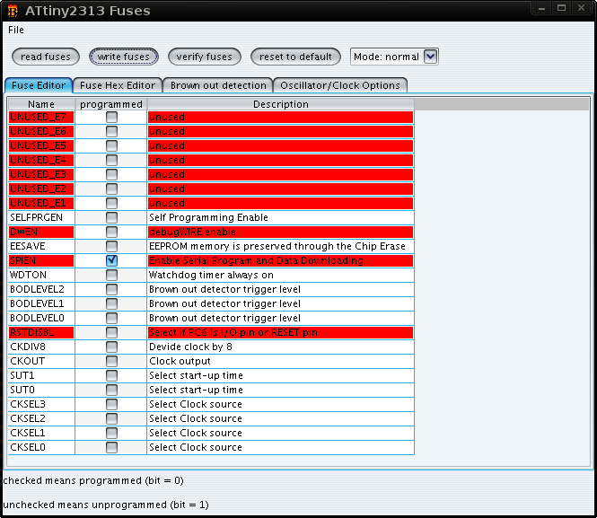 Attiny działa z zewnętrznym kwarcem 10MHz. Obecnie fusebity wyglądają tak: