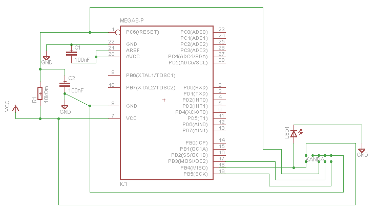 - RESET pod kondensator 100nF do masy i rezystor 10kOm do plusa