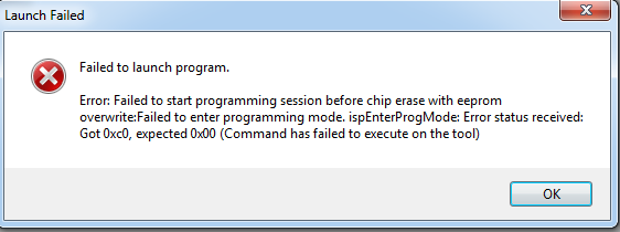 Cytat:Unable to enter programming mode. Please verify that the programmer is correctly attached to the target and that target power has been switched on. Also verify that the correct device and interface settings have been specified.