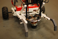 Na zdjęciu i filmie zaprezentowany został robot wykorzystujący ciekawy napęd. Jest to wirująca bardzo szybko półsfera gumowa zawieszona na przegubie kontrolowanym (ang. HOG wheel - hemispherical omnidirectional gimbaled wheel) przez dwa serwomechanizmy . Dzięki wychylaniu go w odpowiednie strony, robot ma możliwość poruszania się po podłożu z niesamowitą szybkością i zwrotnością. Pomysł wykorzystania takiego napędu nie należy jednak do autorów z pewnością nie możemy o nim powiedzieć, że jest nowatorski, ponieważ koncepcję jego wykorzystania zaprezentowano już w 1938 w czasopiśmie Mechanics and Handicraft Magazine (link zamieściłem poniżej). Do tej pory nie znalazł on jednak szerszego zastosowania, ale w tym wypadku z pewnością spisuje się bardzo dobrze. Robot sterowany jest zdalnie przy użyciu modelarskiego sterownika radiowego. Na filmie poniżej zaprezentowano możliwości prostej konstrukcji zbudowanej przy użyciu klocków lego technic, gdzie robot jeździ swobodnie po gładkiej podłodze korytarze prezentując swoją szybkość i zwrotność..
