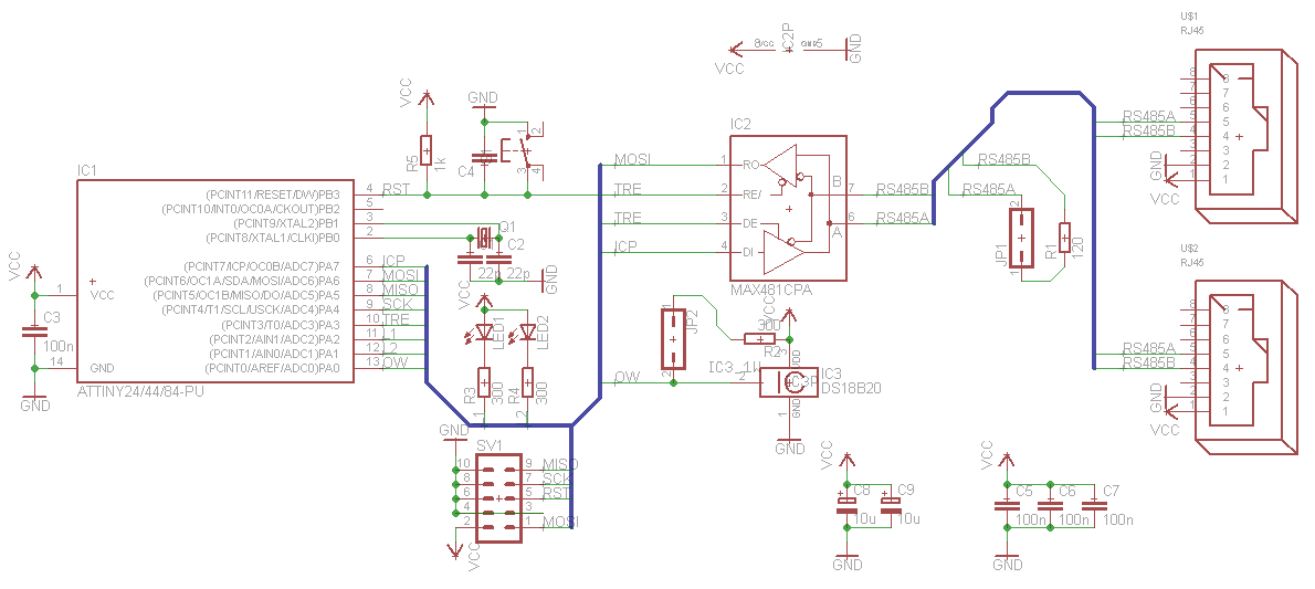 W bibliotekach eagle nie było układu max485, dlatego wstawiłem odpowiadający mu wyprowadzeniami max481.