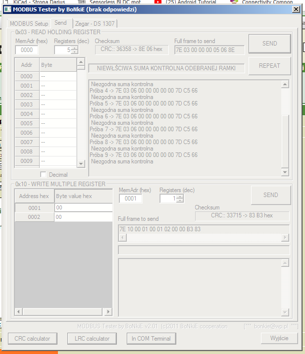 Ostatnio uruchamiałem urządzenie na ATmega128 gdzie zaimplementowałem transmisję MODBUS. Potrzebne mi były tylko dwie funkcje 3 (0x03 - Read Holding Registers) i 16 (0x10 - Write Multiple Registers). Nie mogłem w internecie odszukać czegoś spełniającego moje wymagania co do testowania, więc poświęciwszy 3 wieczory napisałem pod winzgroze program, który wysyła i odbiera te komunikaty.