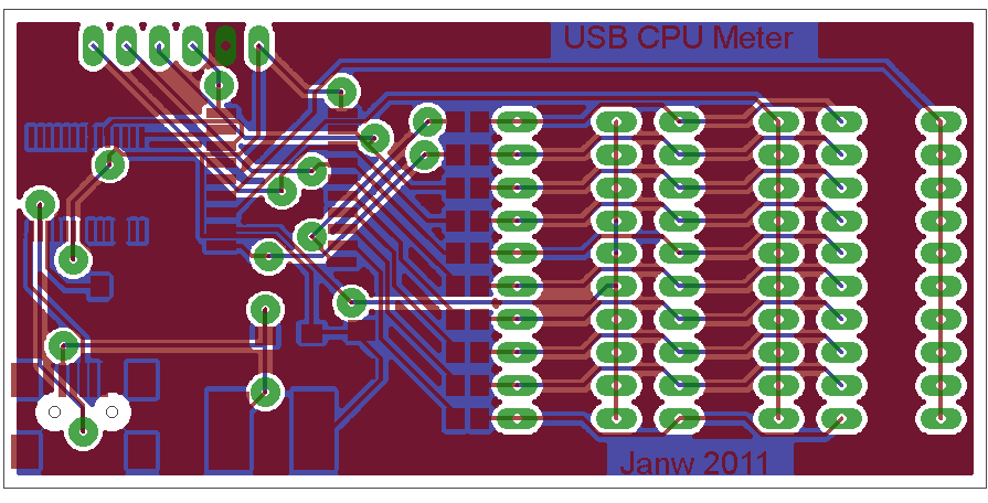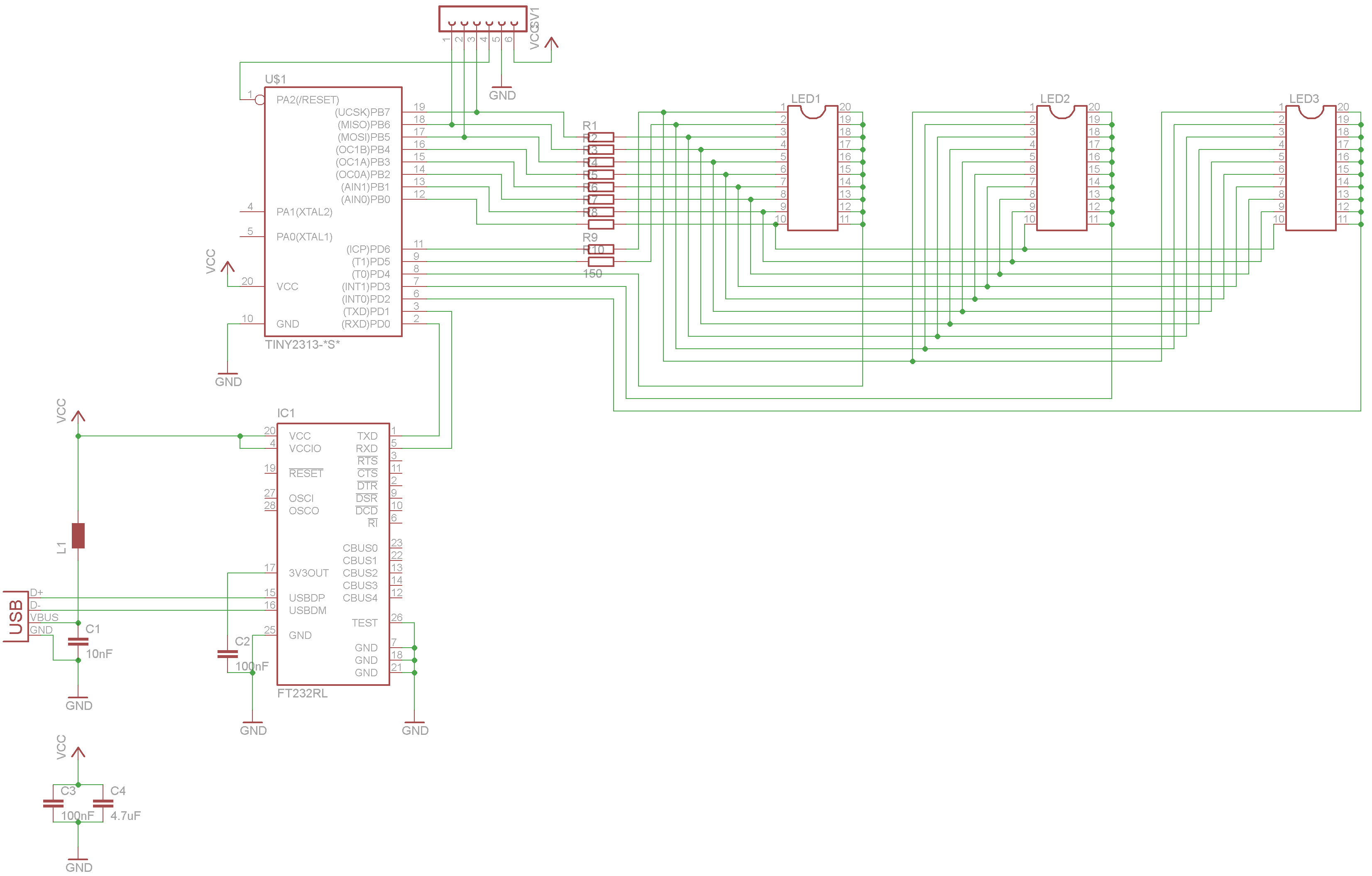 Projekt został zbudowany z elementów SMD. Posiada również własny konwerter UART-USB. Dzięki temu urządzenie jest stosunkowo małe i więcej niż 50% płytki zajmują same wyświetlacze LED. Na stronie źródłowej znajduje się ich dokładna lista oraz instrukcja krok po kroku, jak można zbudować takie urządzenie. Za mikrokontroler posłużył autorowi ATtiny2313, zaś jako układ konwertujący UART-USB wykorzystał znany moduł o symbolu FT232RL. Do wyświetlania stanu pracy wykorzystał wyświetlacze słupkowe LED o oznaczeniu Kingbright DC-10EWA. Poza tym do budowy potrzebne były jeszcze elementy dyskretne, jak kondensatory oraz złącze mini-USB, przewody połączeniowe, obwód PCB oraz specjalne oprogramowanie. Na stronie źródłowej znajdują się linki, z których można pobrać oprogramowanie do urządzenia, a także do obsługi portu szeregowego.