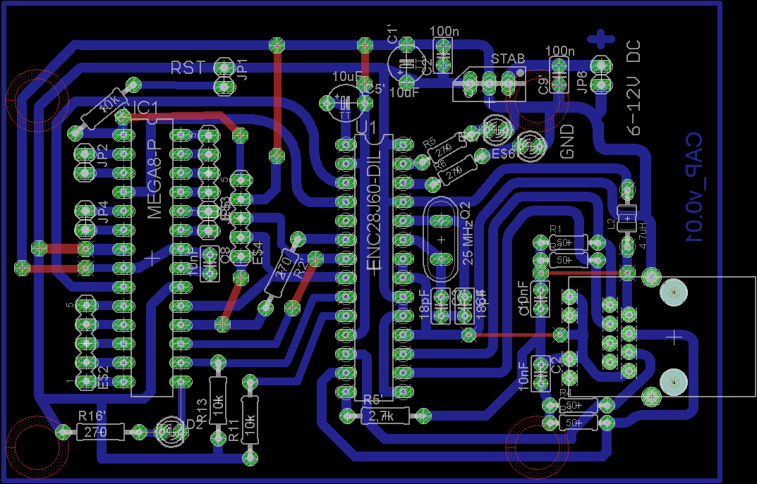 Staram się zrobić urządzenie które za pomocą ethernetu komunikowałoby się z innymi urządzeniami w mojej sieci. Przy projekcie posiłkowałem się projektem Robotrona ze strony http://rototron.info/default.aspx?page=wol/wol.aspx i urządzeniu opartym na Ethernecie opracowanym i opisanym na stronie tuxgraphics ( http://tuxgraphics.org/electronics/200606/article06061.shtml ). Oba projekty są właściwie takie same, z tą tylko różnicą że na tuxie używają AtMegi88 – również ja ją wykorzystuje jak i również kodów z tuxa. Poniżej wklejam projekt mojej płytki…