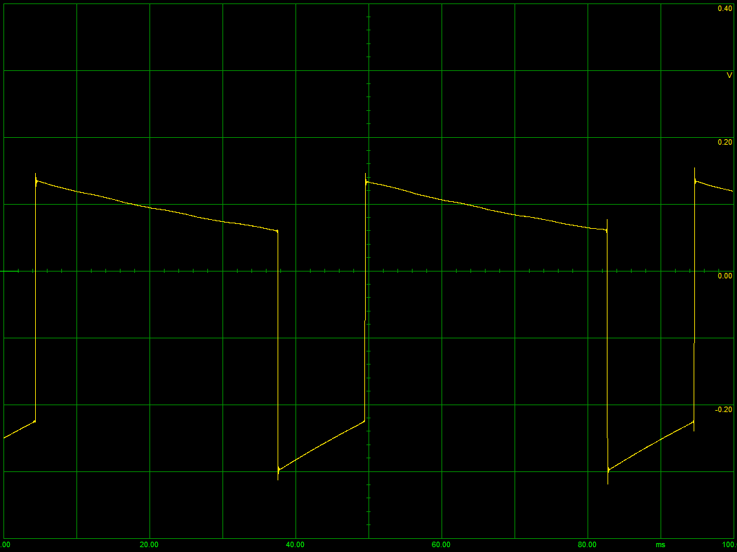 Zmierzyłem dwoma sposobami działanie impulsatora. Na wyjściu umieściłem diodę LED i zakręciłem równomiernie silnikiem krokowym. Dostałem równomierne miganie diody. Drugi sposób to zdjęcie przebiegu oscyloskopem. Jako, że oscyloskopu nie mam to posłużyłem się wersją testową programu Zelscope. Program umożliwia zdejmowanie przebiegów na wejściu karty dźwiękowej.