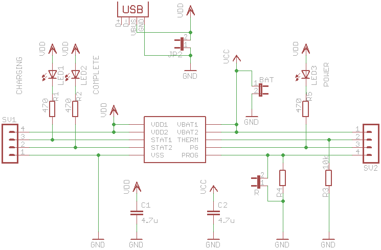 Schemat jest w większości kopią schematu z datasheetu. Zawiera 3 diody LED: jedną dla standby, drugą dla ładowania, trzecią dla zakończenia ładowania. Rezystor R4 użyty został, aby kontrolować prąd ładowania - autor użył w tym miejscu gniazda w celu wymiany rezystorów dla różnych ogniw. Rezystor 10k daje natężenie ładowania ok. 100 mA.