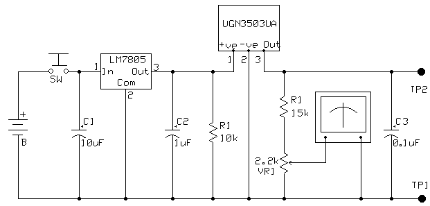 Sercem miernika jest układ UGN3503U lub podobny czujnik Halla. Układ UGN3503U jest liniowym czujnikiem pola magnetycznego i jego wyjście jest proporcjonalne go natężenia pola. Układ zasilany jest z baterii 9V. Regulator dostarcza stabilizowanego napięcia 5V. Bez obecnego pola magnetycznego czujnik na wyjściu podaje napięcie 2,5 V, które rośnie w miarę zbliżania bieguna północnego magnesu i maleje przez zbliżania bieguna południowego. Napięcie wyjściowe z czujnika wynosi 1,3 mV na każdy Gauss natężenia pola magnetycznego.
