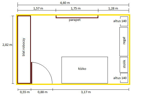 Poza tym chciałbym jeszcze wstawić jakąś szafkę wiszącą nad łóżkiem i może nawet dać jakąś nad blatem, a pod nim zrobić małą szafkę z drzwiami przesuwnymi. Sam jeszcze nie wiem.