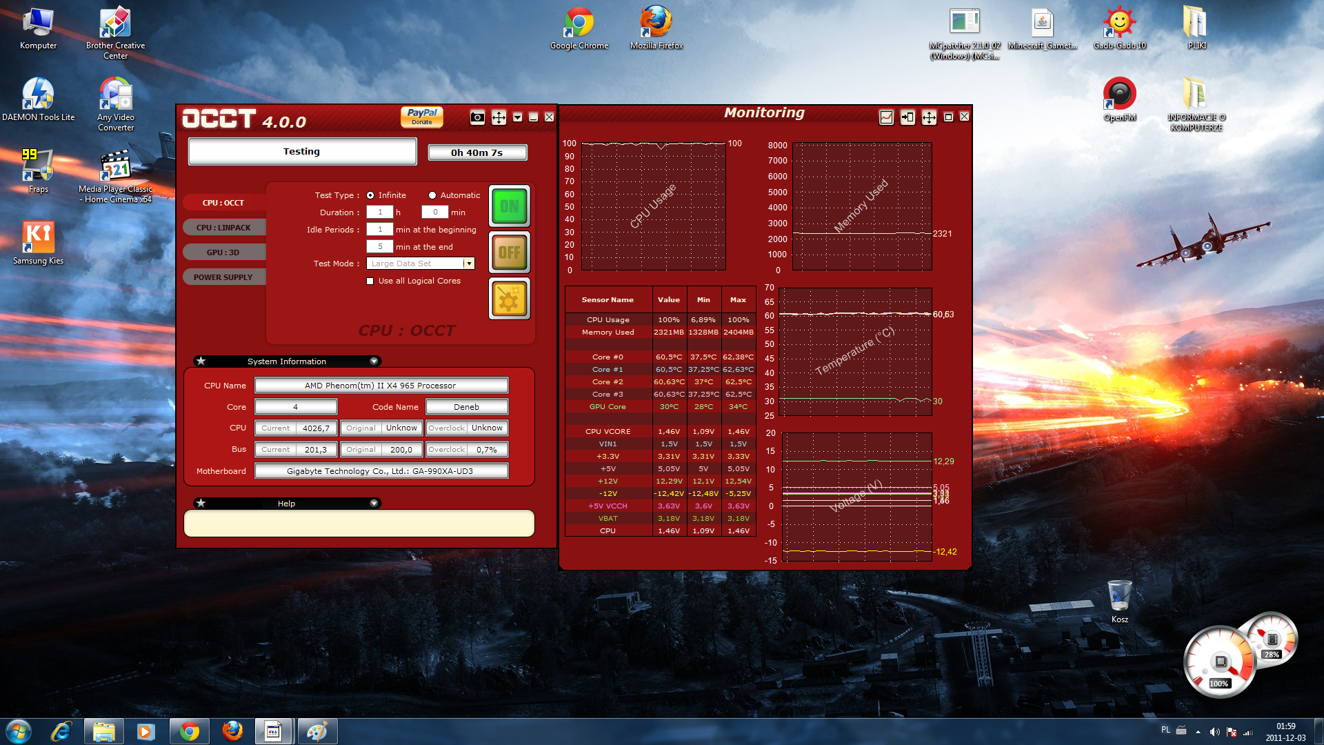 Procesor: AMD Phenom II X4 BE 965, 3,4GHz--->4,0GHz(20x200)