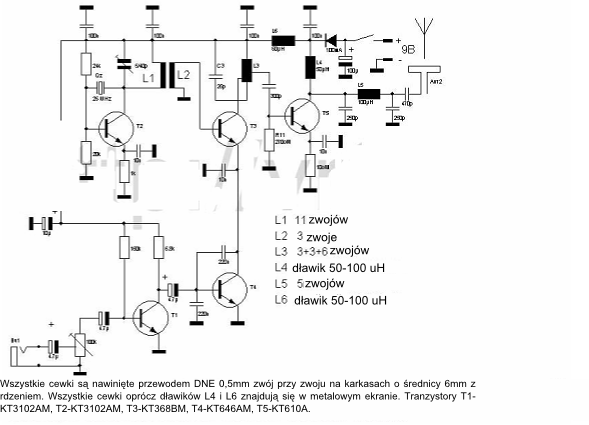 Schemat jest dość prosty - to zwykły nadajnik z modulacją AM dostrojony do częstotliwości 25MHz. Składa się ze wzmacniacza dźwięku, modulatora i generatora wysokich częstotliwości.