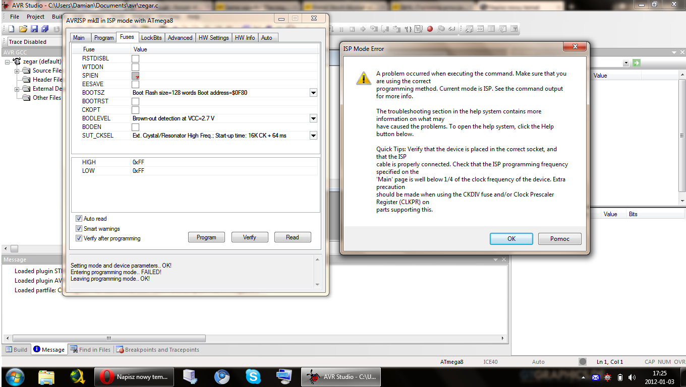 Robię zegar szachowy na płytce uniwersalnej, 2 siedmiosegmentowe wyświetlacze, kilka guzików, nic szczególnego. Układ jest zbudowany na Atmedze8 i nie potrafię się z nią połączyć. Używam oryginalnego programatora AVRISP mkll, na nowszej wersji ATMEGA8a też ten sam problem
