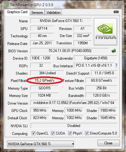Witam! Kupiłem jakiś czas temu grafikę GTX560Ti i zauważyłem że w programie GPU-Z pokazuje mi Pixel fillrate 15.2 Gpixel/s. Po podkręceniu nie zmieniła się ta wartość. W Google można znaleźć screeny cpu-z gtx560ti gdzie wszędzie pixel fillrate wynosi ok. 30 Gpixel/s. Dlaczego ???
