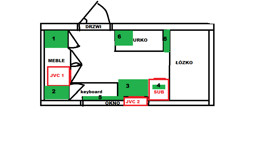 Witam wszystkich forumowiczów... Mam mały problem, a raczej duży... Chodzi dokładnie o położenie kolumn podłogowych JVC S- P55 Czy jeżeli podłogowe to znaczy że muszą stać na podłodze? Mój pokój ma wymiary 5m x 2m malutki jak widzicie i do tego dużo sprzętu muzycznego no ale zrobi sie małe sprzątanie... Dołączam rysunek mojego pokoju i tym czasowego ustawienia...