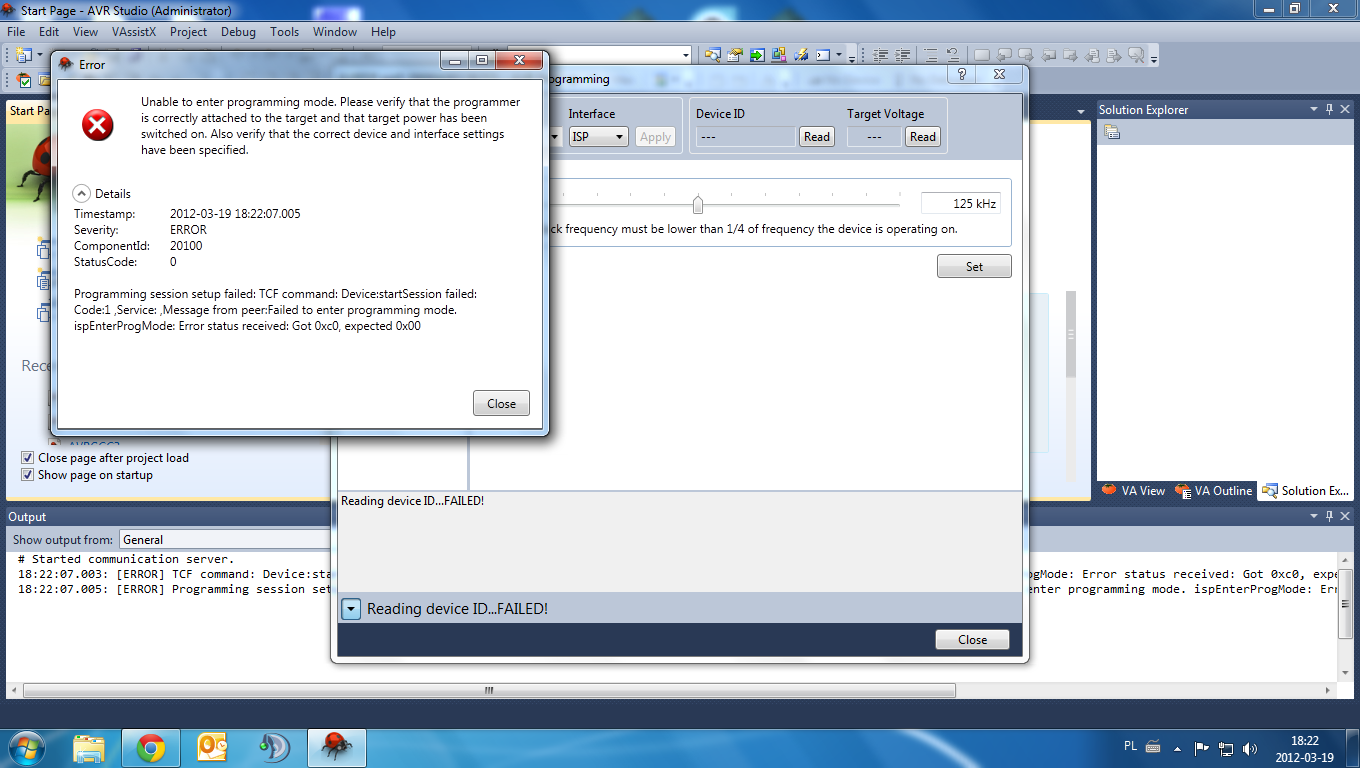 Programming session setup failed: TCF command: Device:startSession failed: Code:1 ,Service: ,Message from peer:Failed to enter programming mode. ispEnterProgMode: Error status received: Got 0xc0, expected 0x00