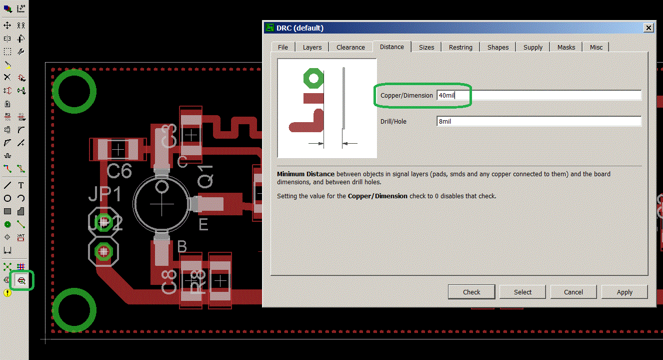 Ale sama ta warstwa powoduje wygenerowanie odstępu od siebie warstwy miedzi. Czyli jeśli chcemy aby blisko krawędzi przebiegała miedź, np. 0.1mm to po poprowadzeniu warstwy dimension po krawędzi program automatycznie cofnie pole miedzi do chyba 0.2mm.