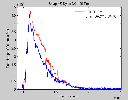 W karcie katalogowej czujnika Sharpa można znaleźć wykres napięcia wyjściowego w funkcji stężenia kurzu w powietrzu wyrażonego w mg/m3, lecz wykres rozpoczyna sie od 0,5 V, a jak pokazały testy przeprowadzone przez Chrisa, napięcie wyjściowe było znacznie niższe. Autor zaaproksymował więc krzywą z wykresu równaniem liniowym, uzyskując zależność napięcia od stężenia kurzu. Następnie porównał wskazania własnego i fabrycznego miernika w tych samych warunkach, uzyskując współczynniki kalibracyjne. Okazuje się, że prosty czujnik za 12 $ sprawuje się bardzo przyzwoicie, a wyniki nie odbiegają zbytnio od miernika za 290 $.