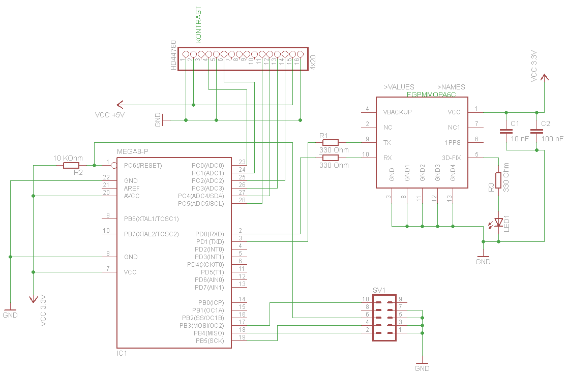 Od kilku godzin tworzę mini projekt, który za pomocą ATmegi8 ma wyświetlić na LCD HD44780 informacje z GPS-a. Na razie wszystkie próby wykonuje w domu dlatego nie mam pewności czy to jest przyczyną, że nie mogę złapać sygnału GPS czy w moim kodzie czy schemacie jest jakiś błąd.